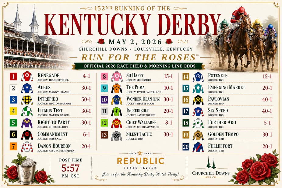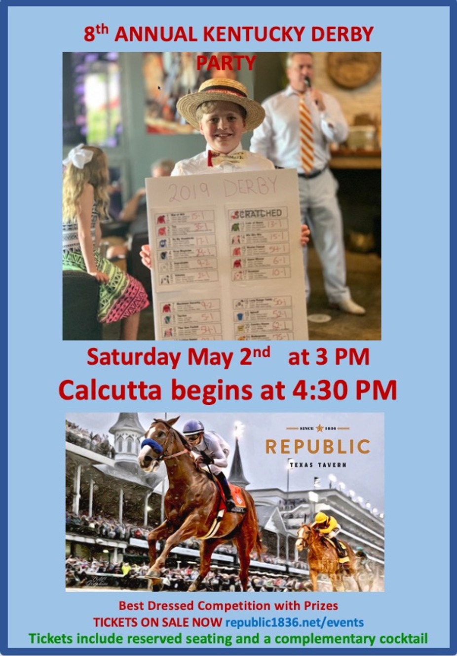 Join Us for the 8th Annual Kentucky Derby Party. The event is free but reserved seating is $15 and comes with a raffle ticket and a cocktail. Tickets can be purchased on our website www.republic1836.net under the events tab. If you want to participate in the Calcutta auction please bring cash. Walk ins are welcome.